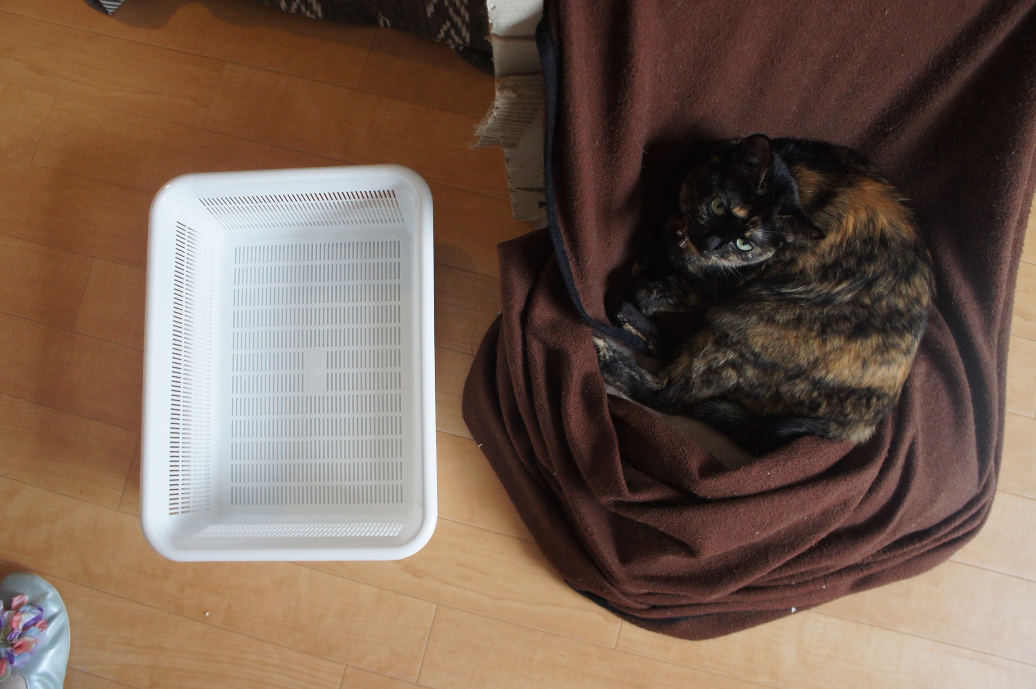今週末は、小旅行で私が一泊する。ビビさん初めての一泊お留守番。先週私が寝込んでいた時、一個のトイレで3回目の用をたすことができなくて、ウンチが外に出ちゃって、とてもあせっていてかわいそうだった。なのでトイレをもう少し買い足さないとと思いホームセンターやペットショップを回っていたのだけど、システムトイレではないザル式のトイレが案外ない。で、保護猫ルゥちゃんのために買ってあった100均のザルとトレイの簡易的なトイレをおいてみて、ビビにはちょっと小さいかな?と思ったけど、気がつけばウンチちゃんとしてた!これたくさん用意する〜!