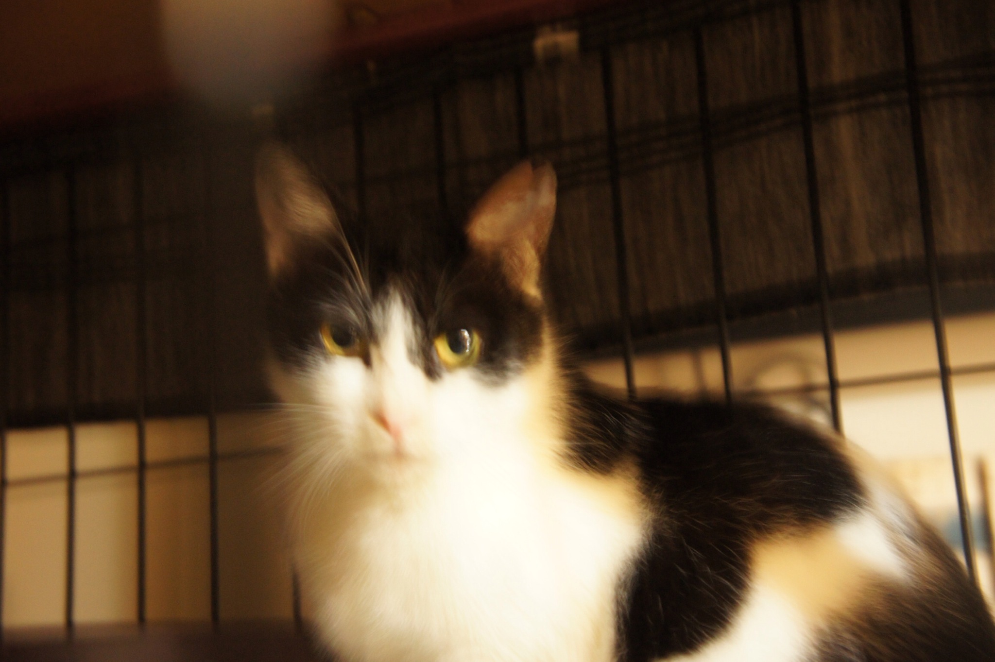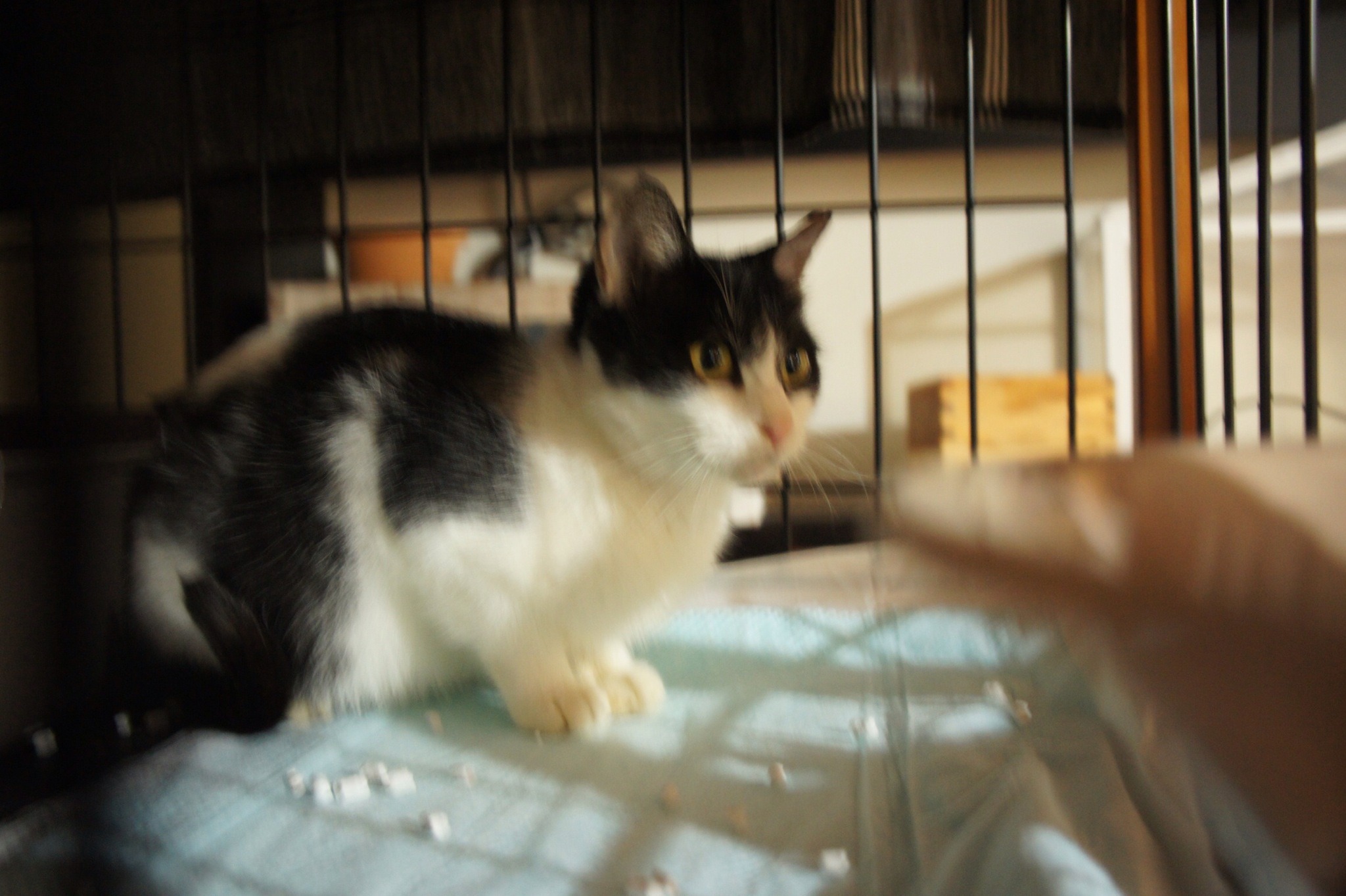 はじめは2階建てのケージの1階部分にしかいないで、まだ未使用のトイレで香箱座りし始めた。なんか、それは嫌だなと思い、じゃらし棒でつついて、シャーされたけどトイレから追い出した。動物病院でもトイレは使わなかったみたいでトイレの認識がないのよね。とりあえずケージの2階部分に餌を置いて、2階の存在を教えたら、2階部分のブランケットのふかふかな所で和んでくれた。とりあえず一安心。