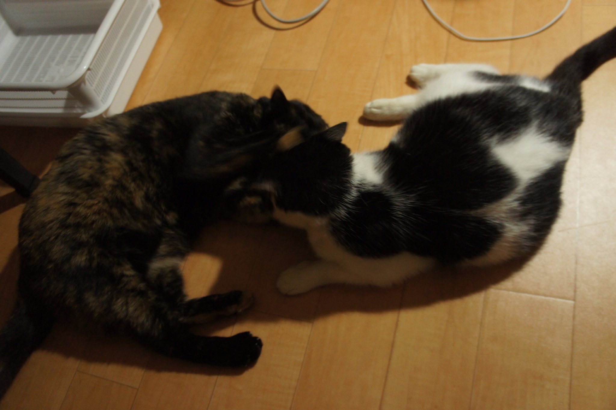 いろんなサイトを見ると出てくるまでに時間がかかるらしいけど、ハレちゃんはあっという間に出てきてビビにスリスリして2匹で嬉しそう。追っかけっこしたりグルーミングしあったり、ハレちゃんはゴロゴロ言ってる!で、私の事はある意味無視で、私の横をすり抜けるのに、私の腕とハレちゃんの身体が触ったのに気にしてなかった。人間に対する警戒心は少し取れてきてるのかな?と思いつつ、捕まえようとするとケージの中に逃げこんだ!なんだ、餌で釣るんじゃなくて、私が捕まえようとすればケージに入るんじゃん。なんだ〜。