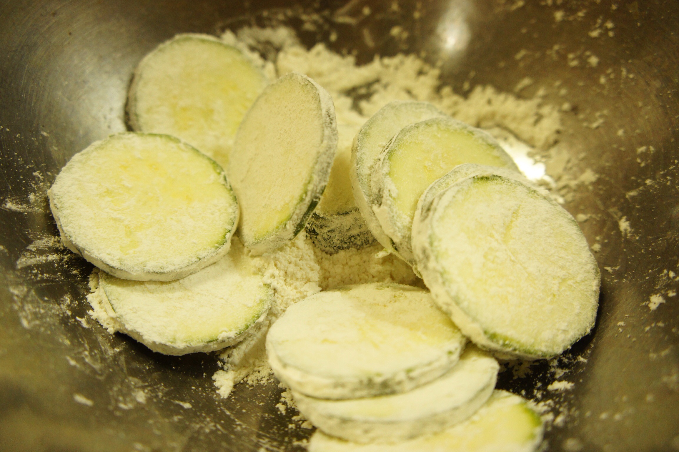 - 輪切りにしたズッキーニに小麦粉をまぶす。