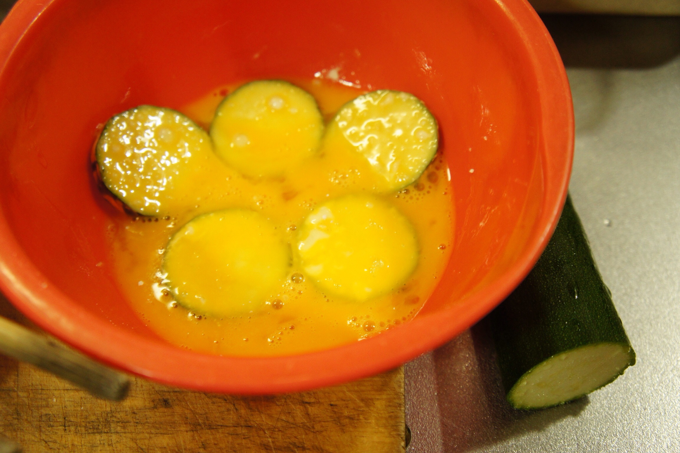 - ボールで卵を混ぜて塩を入れ、ズッキーニをくぐらせる。