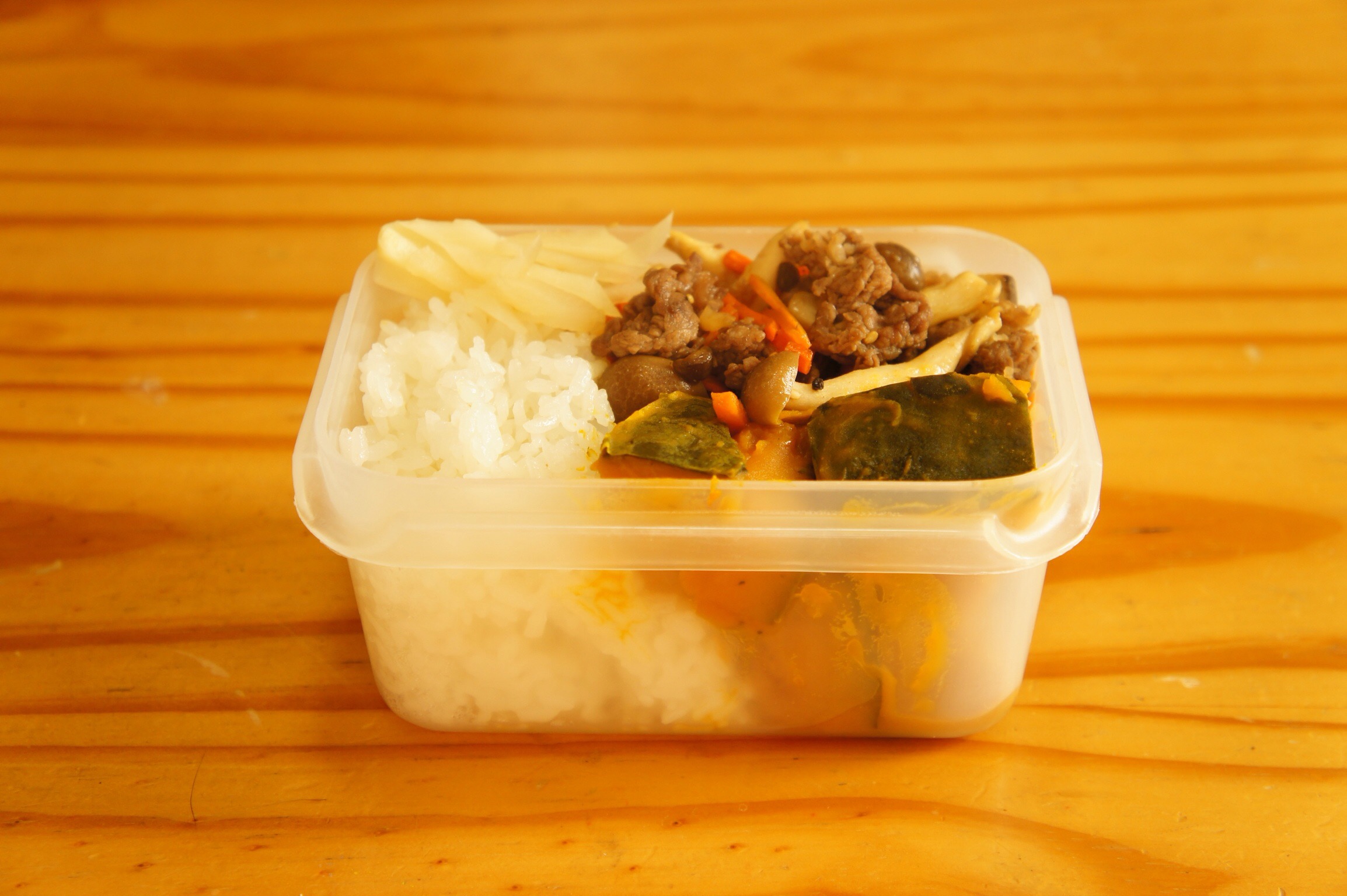 今日もプルコギ弁当。今日はお砂糖を追加して、冷蔵庫の残り物のしめじとエリンギも入れてみた。しめじとエリンギも別のフライパンで炒めてから混ぜてみたよ。
