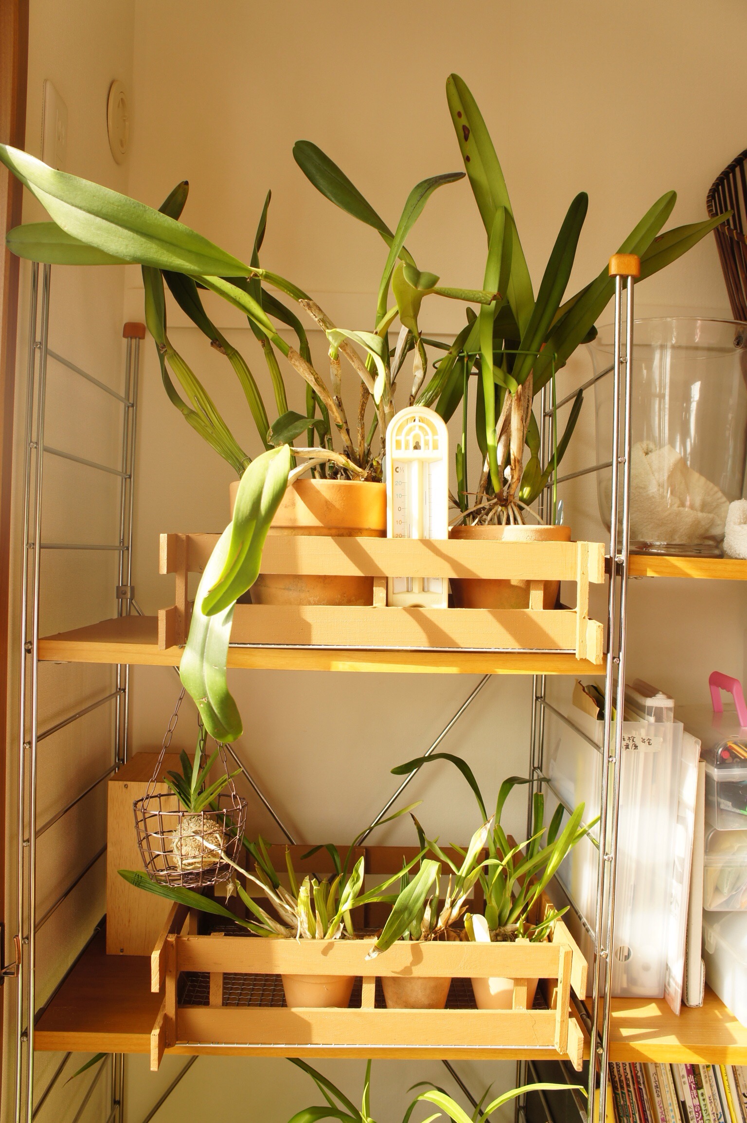 Garden2015.10.15 sazaby 10月頭は蘭を部屋の中に 日に日に寒くなってくる10月。朝方はかなり冷え込んできて10℃を下回るようになってくるので、10月の頭の連休は蘭達を部屋の中に入れた。 今年は棚を部屋に入れたので、大きい蘭達は棚に置いた。 朝、ちょうど陽が当たる。昼間は当たらなくなっちゃうんだけどね。 でも、まだ外で寒さにあたった方が良い子もいて、デンドロビウムとかはまだお外。 それにしても、今年は蘭達の成長が悪かったな。ちょっと遮光しすぎだったのかも。もう少し遮光の網の かけかたを工夫しないと、光が足りない気がする。 共有:クリックして Twitter で共有 (新しいウィンドウで開きます)Facebook で共有するにはクリックしてください (新しいウィンドウで開きます) 関連 コメントを残す コメントをキャンセルメールアドレスが公開されることはありません。 * が付いている欄は必須項目ですコメント * 名前 * メール * サイト 上に表示された文字を入力してください。 新しいコメントをメールで通知 新しい投稿をメールで受け取る Δ