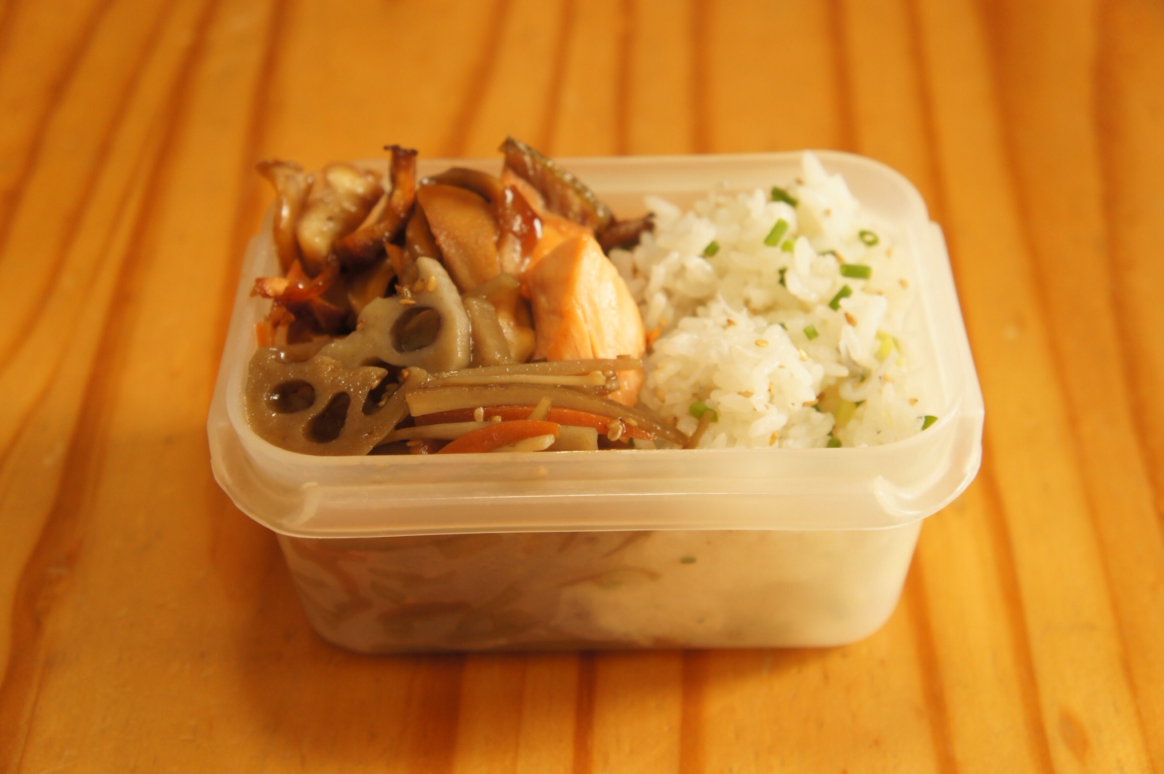 昨日と全く同じお弁当。この組み合わせなかなか良いね。きのこは1種類より何種類か混ぜると風味がまして美味しくなると料理番組で言ってたけど、確かにそうかも。