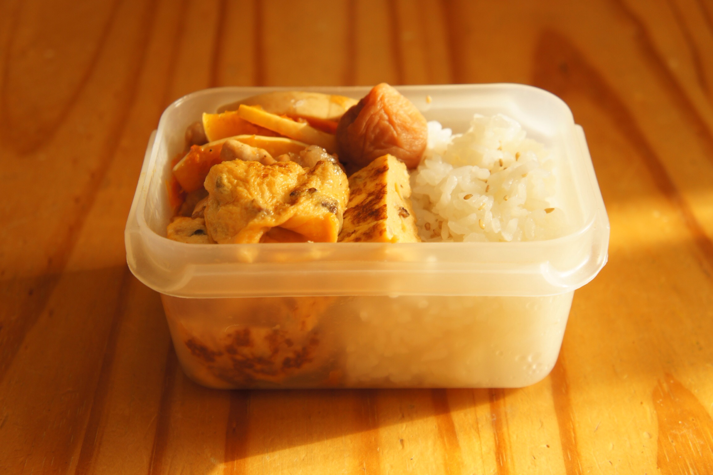 Bento2015.11.12 sazaby かぼちゃと豚肉の照り焼き弁当 今日はかぼちゃと豚肉の照り焼き風にした。豚肉に小麦粉まぶして!油をひかないフライパンで焼いて、レンチンしたかぼちゃと一緒に、照り焼きの合わせ調味料を絡ませる。合わせ調味料は、酒、醤油、みりん、そしてごま油を入れてみた。今度はごま油を入れないで、甘みの物を入れよう。 かぼちゃと豚肉の照り焼き 椎茸入り卵焼き 梅干し ゴマご飯 共有:クリックして Twitter で共有 (新しいウィンドウで開きます)Facebook で共有するにはクリックしてください (新しいウィンドウで開きます) 関連 コメントを残す コメントをキャンセルメールアドレスが公開されることはありません。 * が付いている欄は必須項目ですコメント * 名前 * メール * サイト 上に表示された文字を入力してください。 新しいコメントをメールで通知 新しい投稿をメールで受け取る Δ