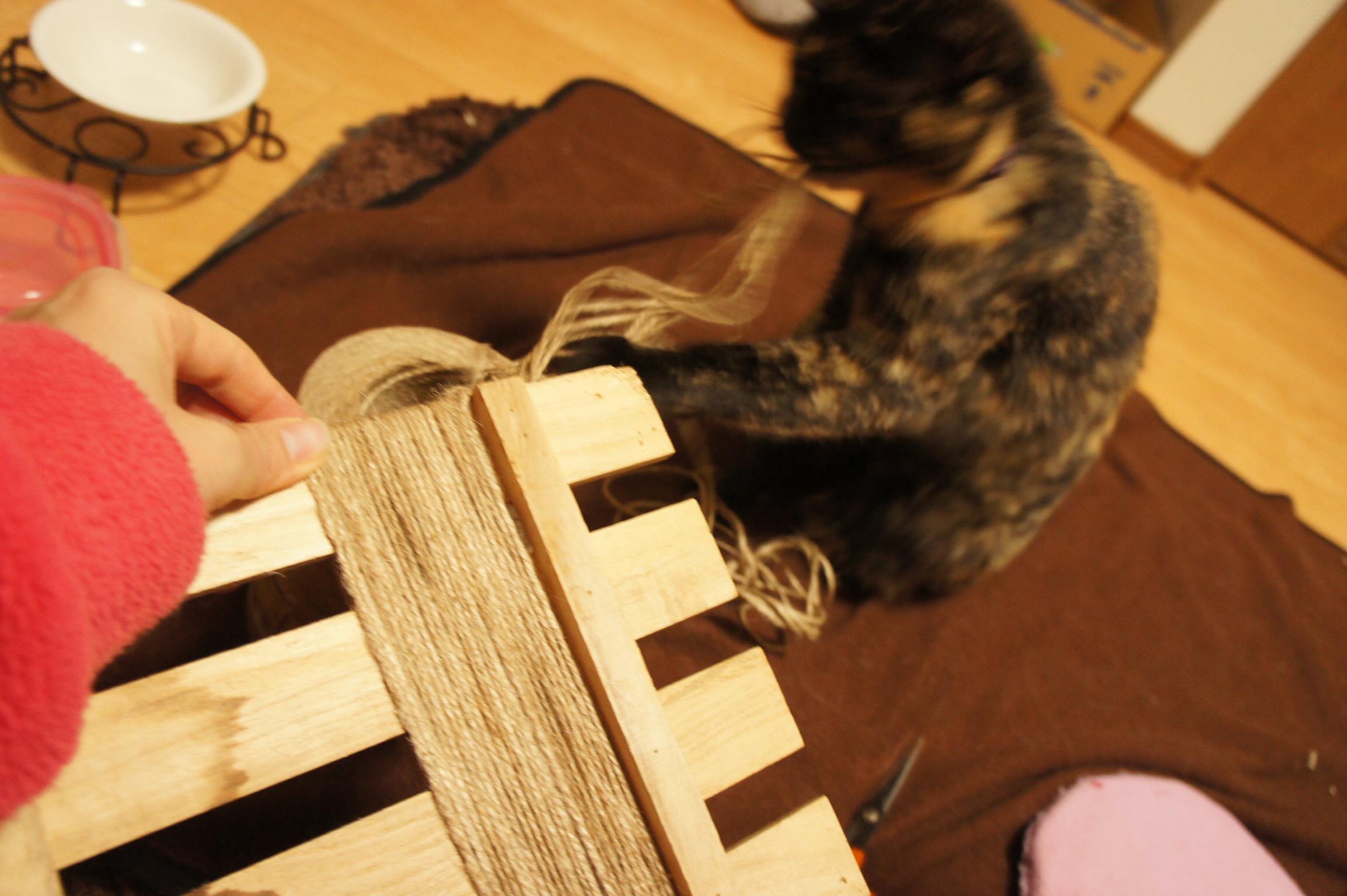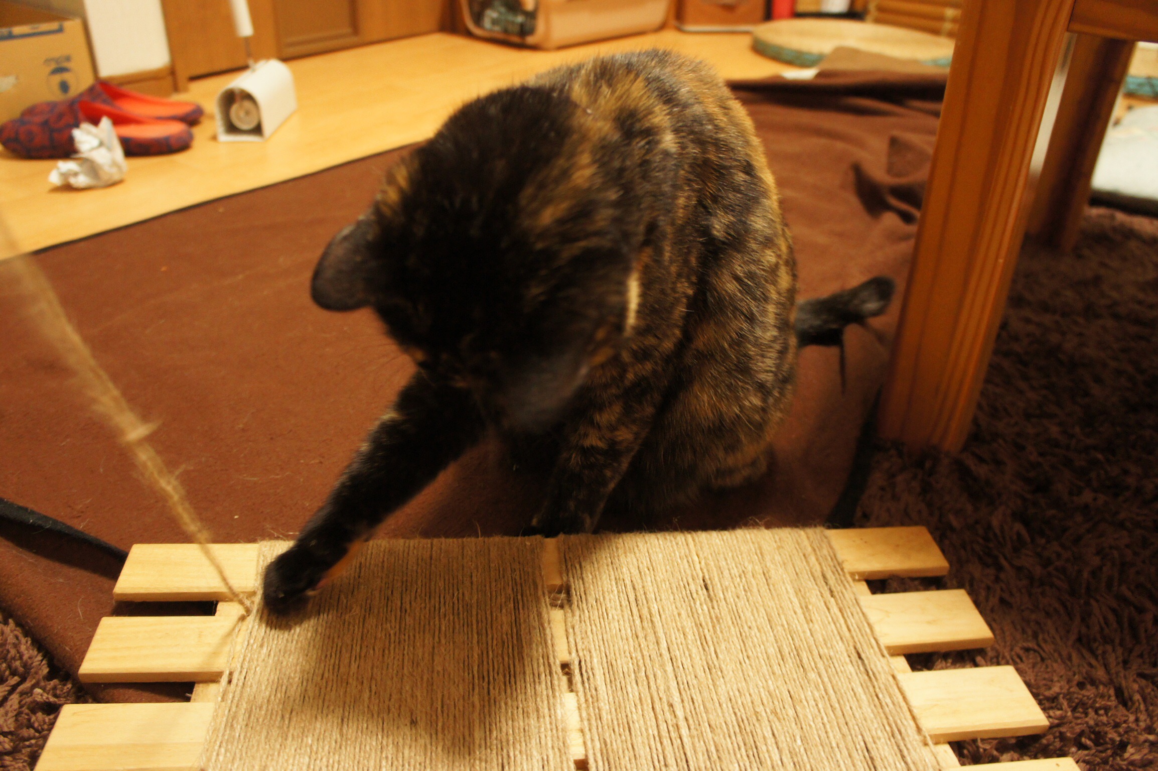 Bibi2016.01.02 2016.01.03 sazaby スノコと麻紐で爪とぎ作ってみた ビビもハレも段ボール系の爪とぎが好きなんだけど、ゴミがすごいんで、100均のスノコと麻紐で手作りしてみる事にした。 ビビにも手伝ってもらう(うそ) ビビは紐が大好き。 爪とぎしてくれた! でも、やっぱり紐が好き。 テーブルの足にくくりつけて完成。 ハレのはこの場所の爪とぎが好きなんだけど、一回爪とぎして、なんか違うって感じでやめちゃった…。お気に召さなかったかなぁ…。 共有:クリックして Twitter で共有 (新しいウィンドウで開きます)Facebook で共有するにはクリックしてください (新しいウィンドウで開きます) 関連 コメントを残す コメントをキャンセルメールアドレスが公開されることはありません。 * が付いている欄は必須項目ですコメント * 名前 * メール * サイト 上に表示された文字を入力してください。 新しいコメントをメールで通知 新しい投稿をメールで受け取る Δ