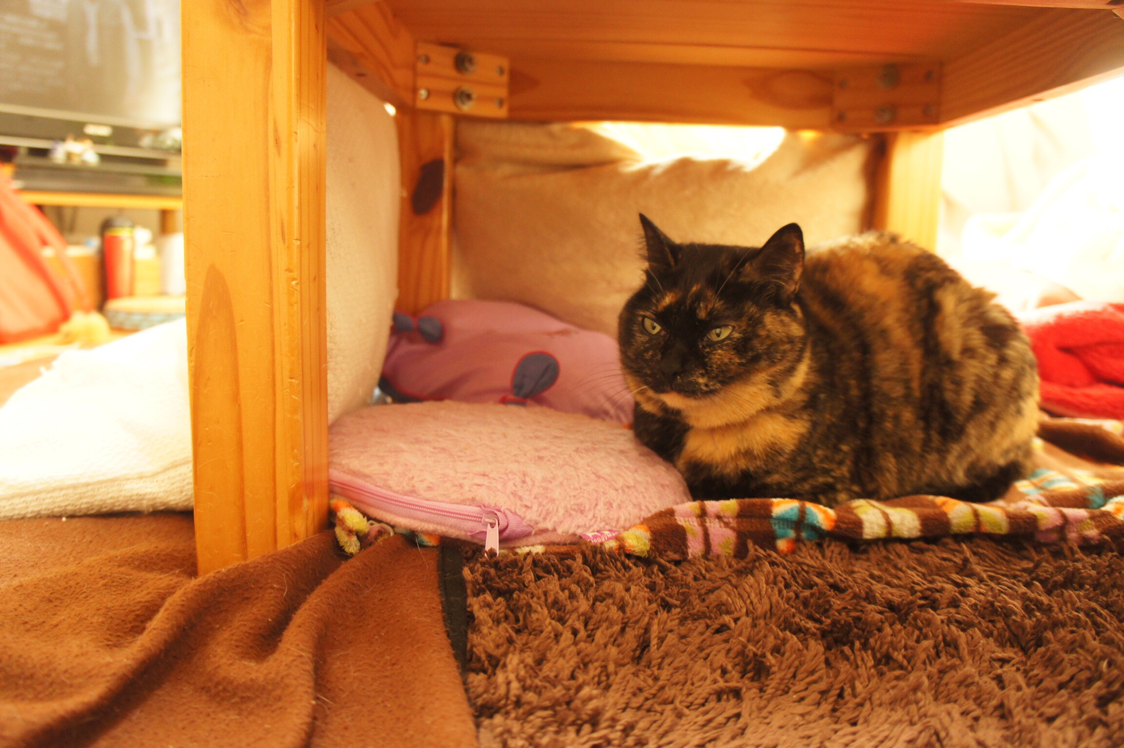 Bibi2016.01.26 sazaby ほぼこたつ 寝る前と出かける時は、テーブルの周りにクッション置いて、テーブルの下にあんか置いて、さらにこの上からブランケットかけて、ビビハレが寒くないように、ほぼこたつ状態。 人間もたまに猫達に混ざって頭を入れてみる。やっぱりこたつはイイよね〜。 共有:クリックして Twitter で共有 (新しいウィンドウで開きます)Facebook で共有するにはクリックしてください (新しいウィンドウで開きます) 関連 コメントを残す コメントをキャンセルメールアドレスが公開されることはありません。 * が付いている欄は必須項目ですコメント * 名前 * メール * サイト 上に表示された文字を入力してください。 新しいコメントをメールで通知 新しい投稿をメールで受け取る Δ