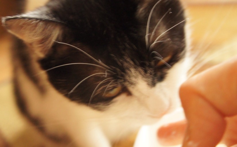指もペロペロ舐めるよ。 でもまだ人間を避けるし、捕まえる事ができない。なのでまだまだ飼い猫修業中。