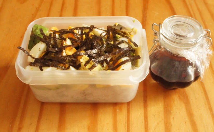 週末旅行明けのお弁当は楽チン弁当。冷凍しておいた雑穀米にアボカドとゆで卵をおいて海苔をかけたアボカド丼。食べる直前に麺つゆをかけて食べます。