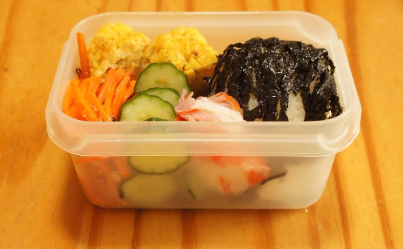 高野山の居酒屋で出たおにぎりは海苔を巻くんじゃなくて、細く刻んだ海苔が振りかけてあって、それを真似てみた。 おにぎり キャベツ入り卵焼き ニンジンサラダ きゅうりの塩もみ カニカマ