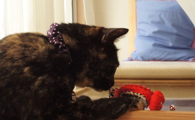 あっという間にボロボロになってしまった手作りの首輪。なので、今度は紫色の首輪に衣替え。ちりめんの首輪は人間的には気に入っていたんだけど、後ろ足でカリカリやってるうちにボロボロになっちゃう。でも、また手作りの…