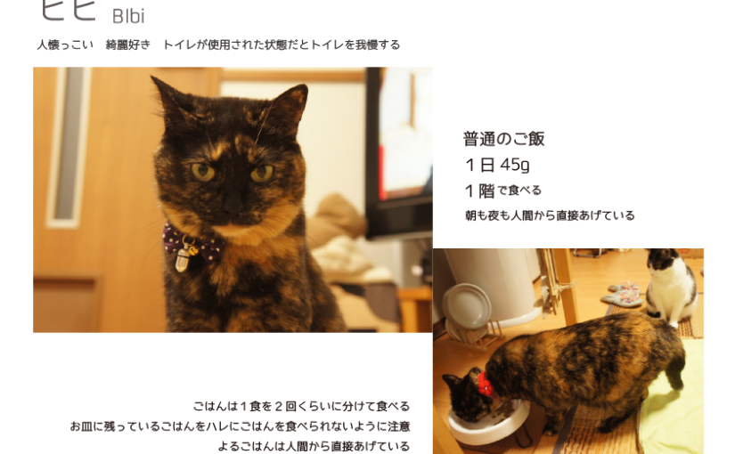 ふと思いついて こんなの作ってペットシッターさんに渡しておいた。はじめて見る人にはどっちの猫がどっちやら、って感じだもんね。