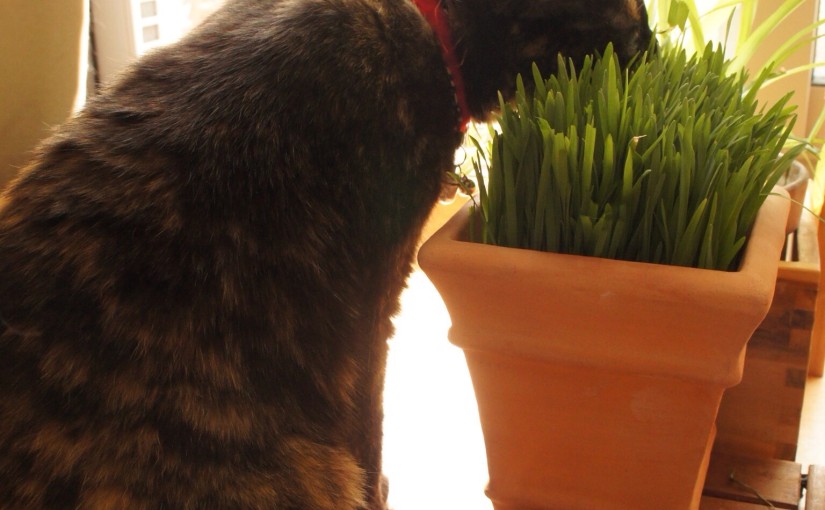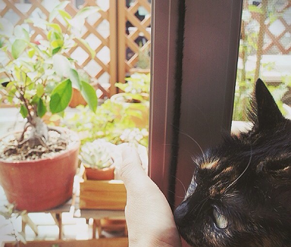 最近、朝、ベランダを眺て植物達の様子を眺めるのが私の日課。そして、必ずビビも近くに来てゴロゴロ言いながら一緒に外を眺めてる。網戸が閉まっている状態だったら和みのひとときだけど、水をあげたり写真撮ったりするの…