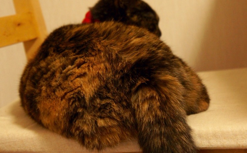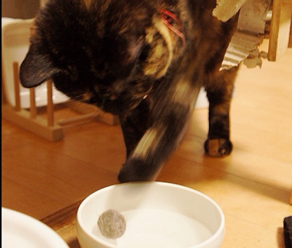 ビビが最近好きなおもちゃは、自分の毛を丸めた毛玉。でも、これが最近、水飲みに浮かんでることがあって、週末見てたら、ビビが加えてわざと入れてた…。で、毛のまわりの水を舐めるという、人間には理解できない行動をし…