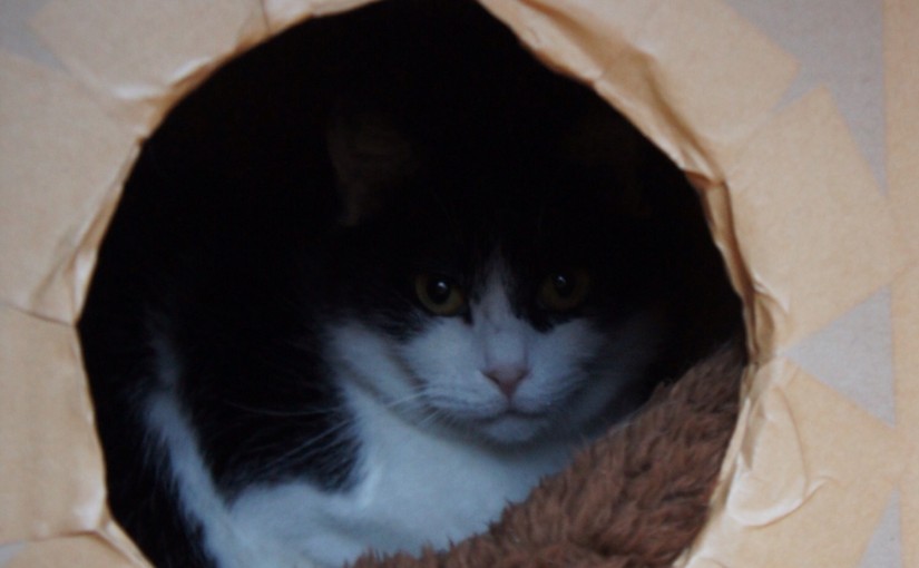 週末の日中は相変わらず、ケージ内のこの段ボールの中で眠り続けるハレちゃん。 ハレちゃんの爪は3月末に切って以来、切っていない。なんとか切れないかと思い、思い切って、この段ボールに入ったまま、この穴の中に両手…