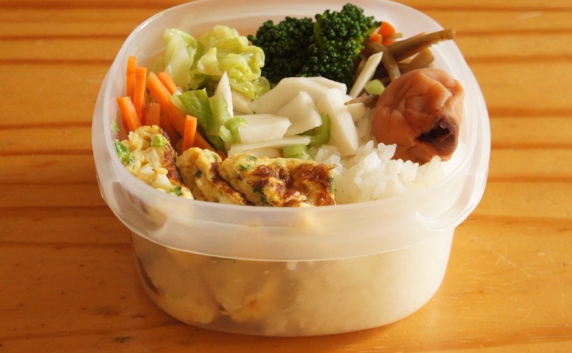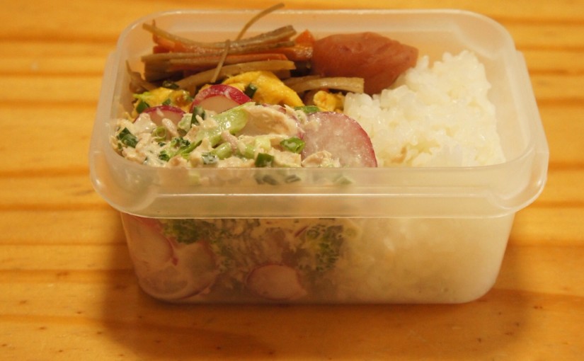 昨日とほぼ同じだね! 春きゃべつとささみのマリネ きんぴらごぼう 小葱入り卵焼き 梅干し 胡麻入りご飯