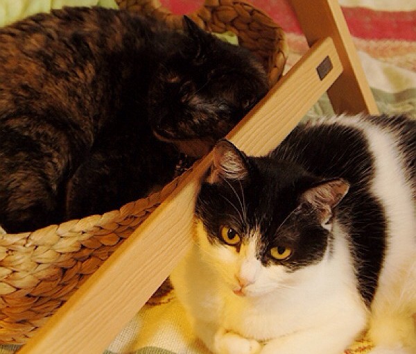 相変わらずビビに甘えたいハレ。2匹がのびのび入れる猫ベッド買う?いや、作るか…。