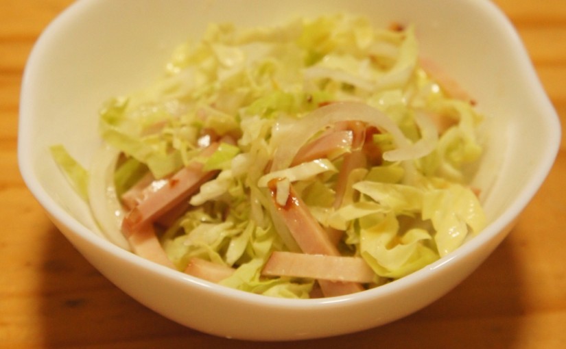 これはサラダといっても、飲みたくなるつまみサラダ。 新玉ねぎは薄くスライスして水にさらす。春キャベツは千切り。焼豚も細めの棒状にカット。で、それらをまとめて、ごま油をかけて、塩を振る。
