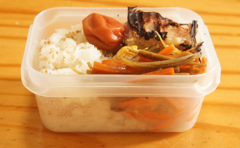 ちょっと魚がこんがり焼けすぎちゃった。そしてきんぴらごぼうの下にニンジンサラダが隠れてるけど、ま、気にしない。 赤魚の粕漬け焼き 小葱入り卵焼き きんぴらごぼう ニンジンサラダ 梅干し 胡麻まぜご飯