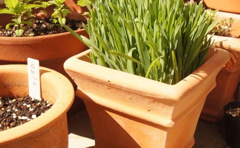 ゴールデンウイークに種を蒔いたネコ草がだいぶ大きくなって食べごろかな?ネコ達に荒らされる前にパチリ。 いつもプラスチックの軽い植木鉢で育ててたけど、倒されたりして散らかるので、今回は倒れないように素焼きの鉢…
