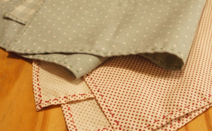 作ったといっても、布の周りを5mm幅で三つ折りにしてアイロンかけて、刺繍糸で並縫いしただけね。