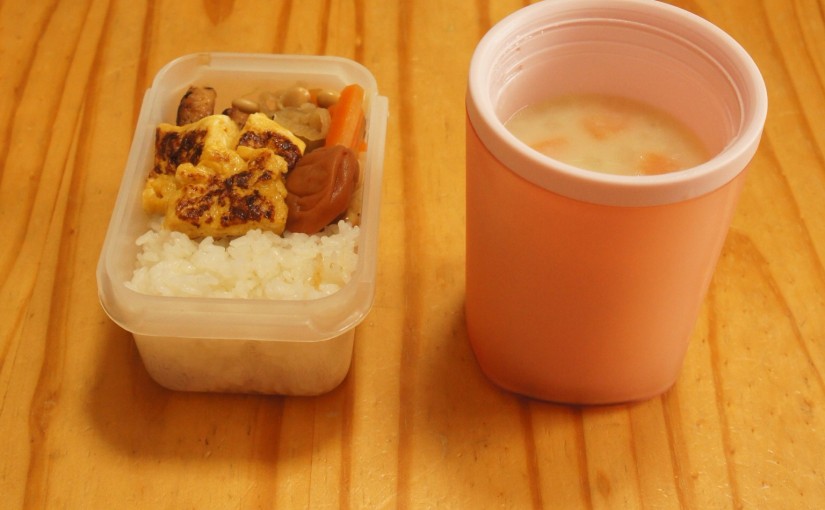 具がゴロゴロ入ってないとシチューって言えないよね…? スープ 鳥つくねのハンバーグ 卵焼き 切り干し大根 梅干し ご飯