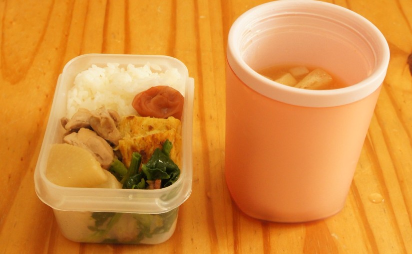 とりもも肉と大根の煮物 キャベツ入り卵焼き ほうれん草のごま油炒め 梅干し 大根とおあげのお味噌汁