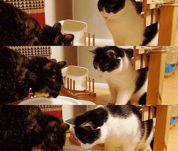 ハレ、ガマン中 ハレ、食べたいなぁ ハレ、食べちゃお。 そして、人間が止めに入る。止めないとビビはご飯をハレにゆずっちゃうんだよね。 でも、前はすぐに食べようとしてたから少しはガマンできるようになったハ…