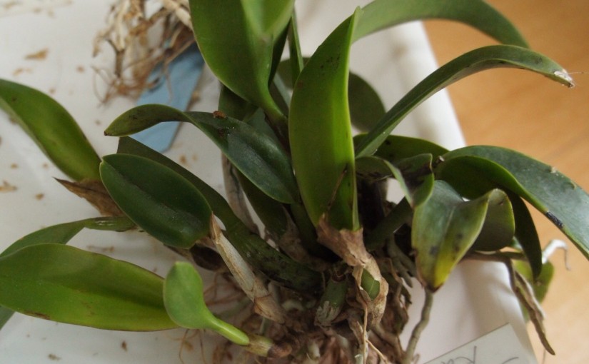 梅の花も咲いたので、ミニカトレアの植え替えしました。素焼き鉢の中で根がカチカチにはっていたので、ハンマーで割る。これだから、蘭には高い植木鉢を使いたくないのよね…。 蘭の大事な大事なラベルもボロくなったのは…