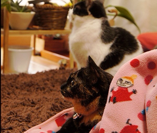 ビビもネズミのおもちゃすごい気に入って、ネズミ部分に匂い付けまでして、張り切って遊ぶんだけど、ハレちゃんが遊び始めると遠くで見守る。ビビはお姉さんだからガマンする。そして餌も譲っちゃうんだけど、それだとハレがデブる…