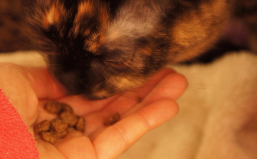 手からだとポツポツ食べるので、最近は手であげる。そうするとすでに自分の分を完食したハレも来るので、ハレにも一粒づつあげて時間稼ぎしながらビビに食べさせる。甘やかしすぎですね〜。