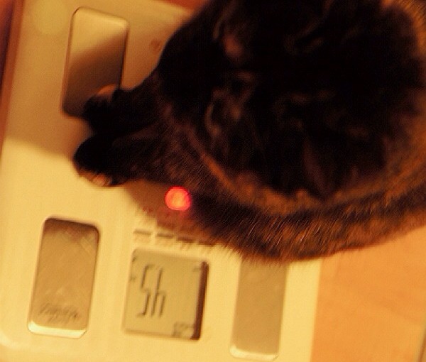 ペット機能付きのタニタの体重計。別にビビが体重気にして乗ってるわけではないよ。 この体重計、人間がペットを抱えて体重計に乗り、その後人間だけが乗って引き算をしてくれるだけなんだけど、ビビの誕生日を入れてあるので、歳と…
