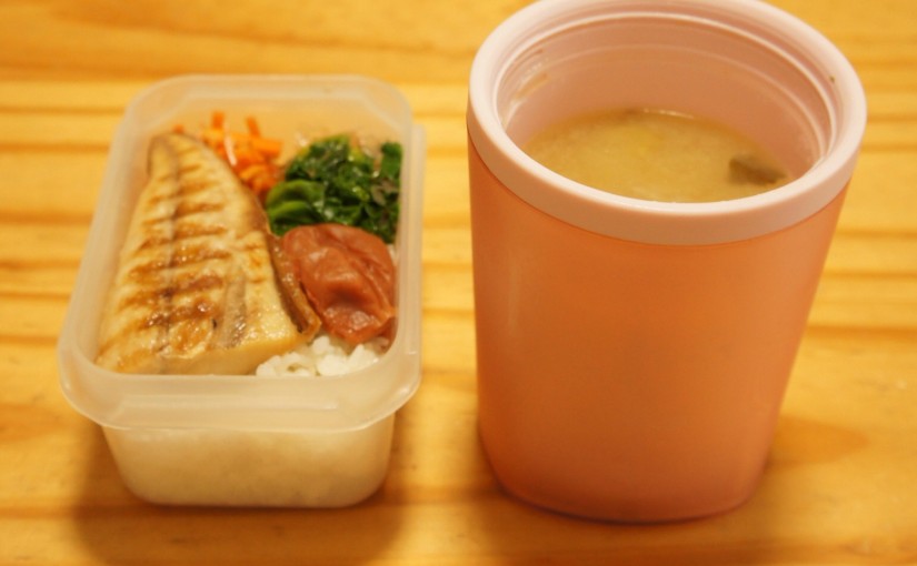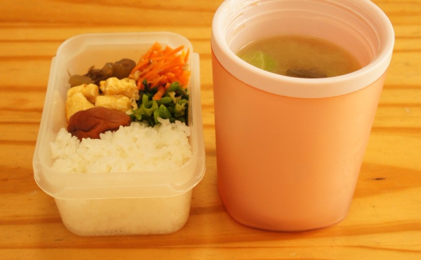 豆腐とわかめのお味噌汁 人参とくるみとレーズンのサラダ ふきの煮たの 卵焼き ちぢみほうれん草のごま油炒め 梅干し ご飯
