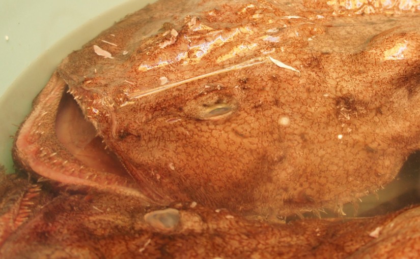 現在茨城在住の私。なのに、アンコウ鍋を食べたことがない。なので那珂湊というみなとに行って、さばいてあるあんこうを買ってきて鍋にして食べました。写真は港で撮ったあんこうね!