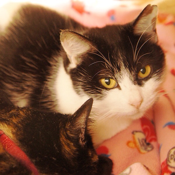 窓辺のパトロール用に置いた椅子。冬でも日差しが暖かい日は、ここで和むビビ。ここでビビが和んでいると、人間を警戒しつつもハレもやってきて、ビビと一緒にこの場所に寝そべろうとする。すると狭いのでビビが譲る。ビビも譲るけど、や…