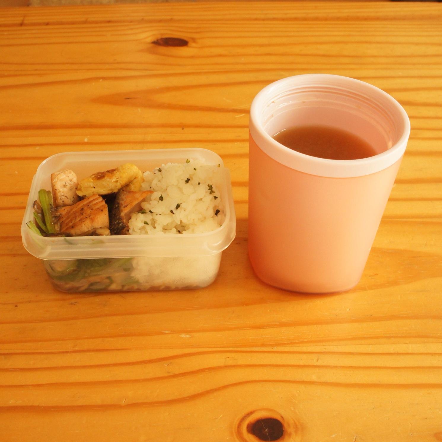 秋鮭と小松菜ときのこのソテー ブロッコリーの茹でたの しその実の塩漬け混ぜご飯
