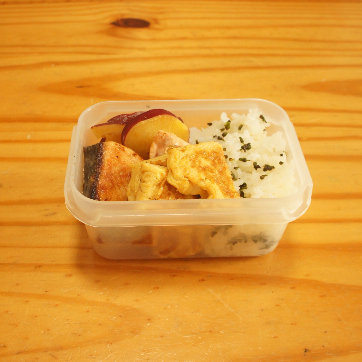 秋鮭のムニエル さつまいものレモン煮 卵焼き シソの実の塩漬け混ぜご飯