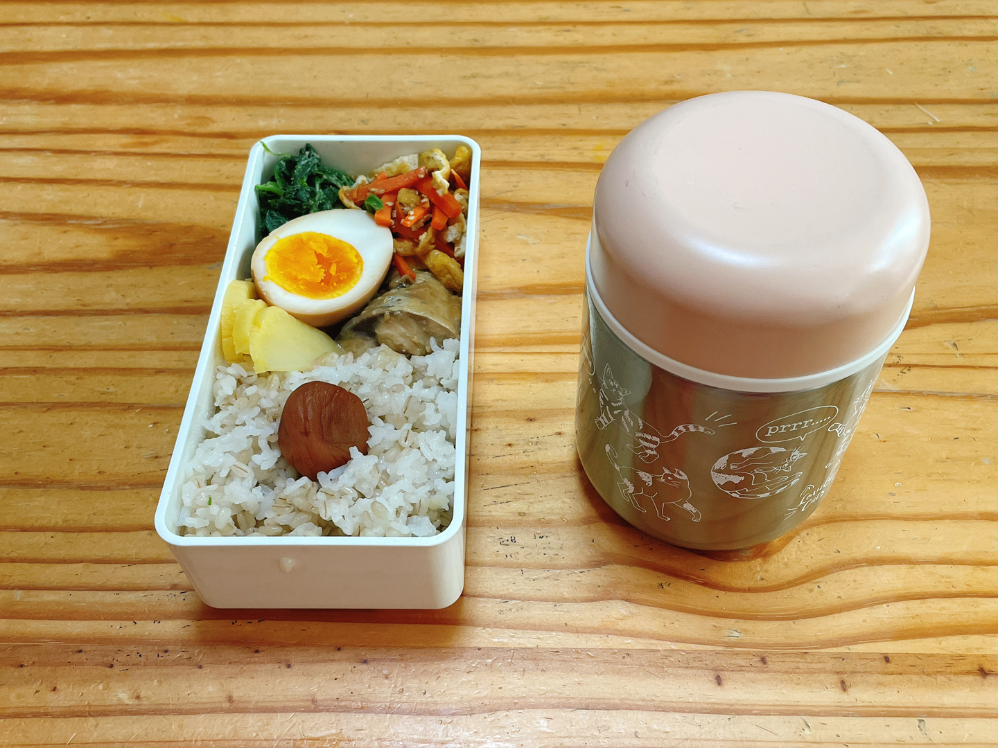 金曜日の血液検査に備えて今日もサバの味噌煮弁当。 サバの味噌煮 にんじんとお揚げのキンピラ ちぢみほうれん草の胡麻和え 味付け卵 たくあん 梅干し もち麦入りご飯 長ネギとしめじのお味噌汁