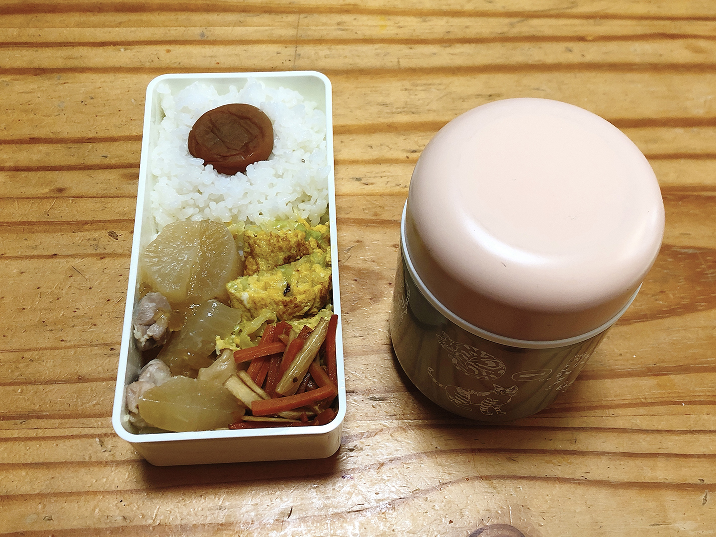 大根を煮る匂いは冬の匂い。今日は大根づくしのお弁当。 大根と鶏もも肉の煮物 大根の皮とにんじんのキンピラ キャベツ入り卵焼き お味噌汁 梅干し ごはん
