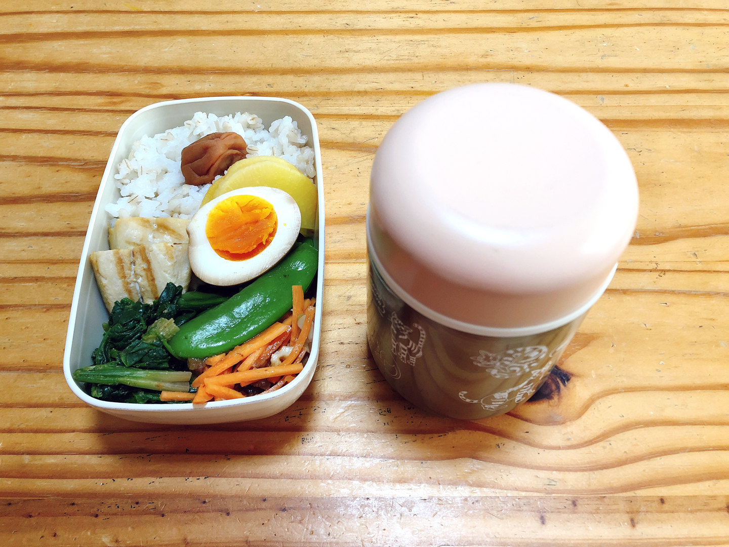 週一回の出社日。 さばの塩焼き ほうれん草の胡麻和え ニンジンとレーズンとクルミのラペ スナップエンドウの茹でたの 味付け卵半分 たくあん 梅干し もち麦入りご飯 お味噌汁