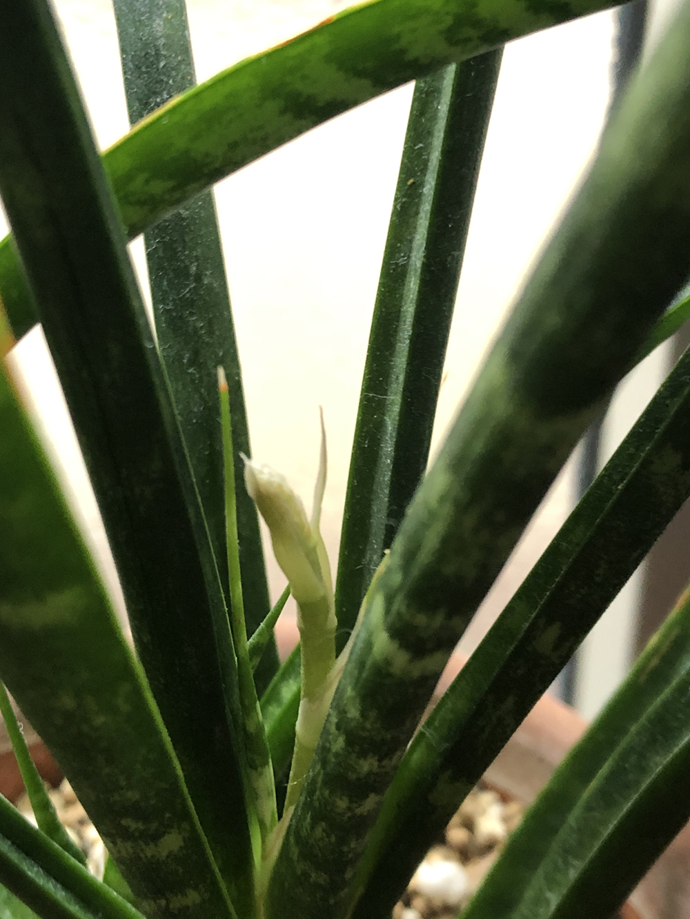職場から保護してきた細いタイプのサンスベリアに花芽がついた!サンスベリアも色々な種類があるみたいなんだけど、そういえばこれはなんという名前なんだろう?スッフルチコーサかな?