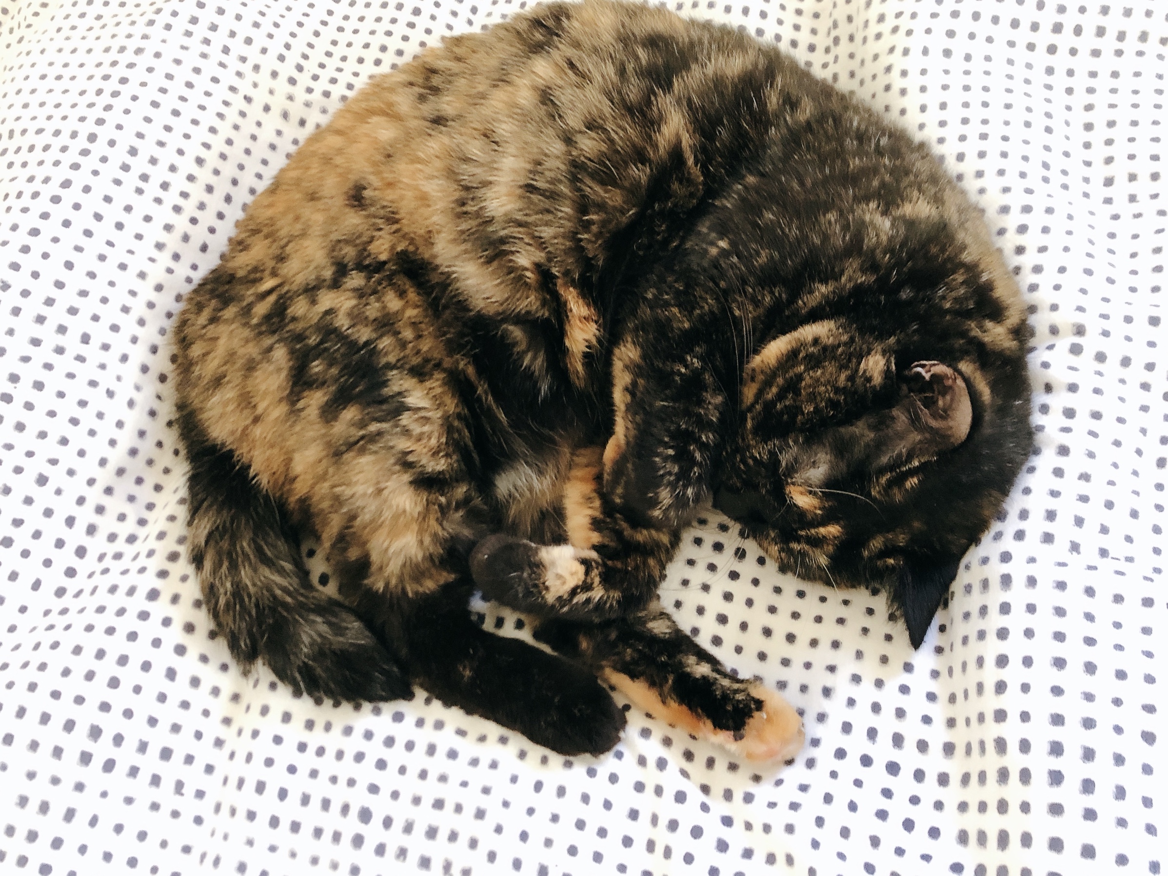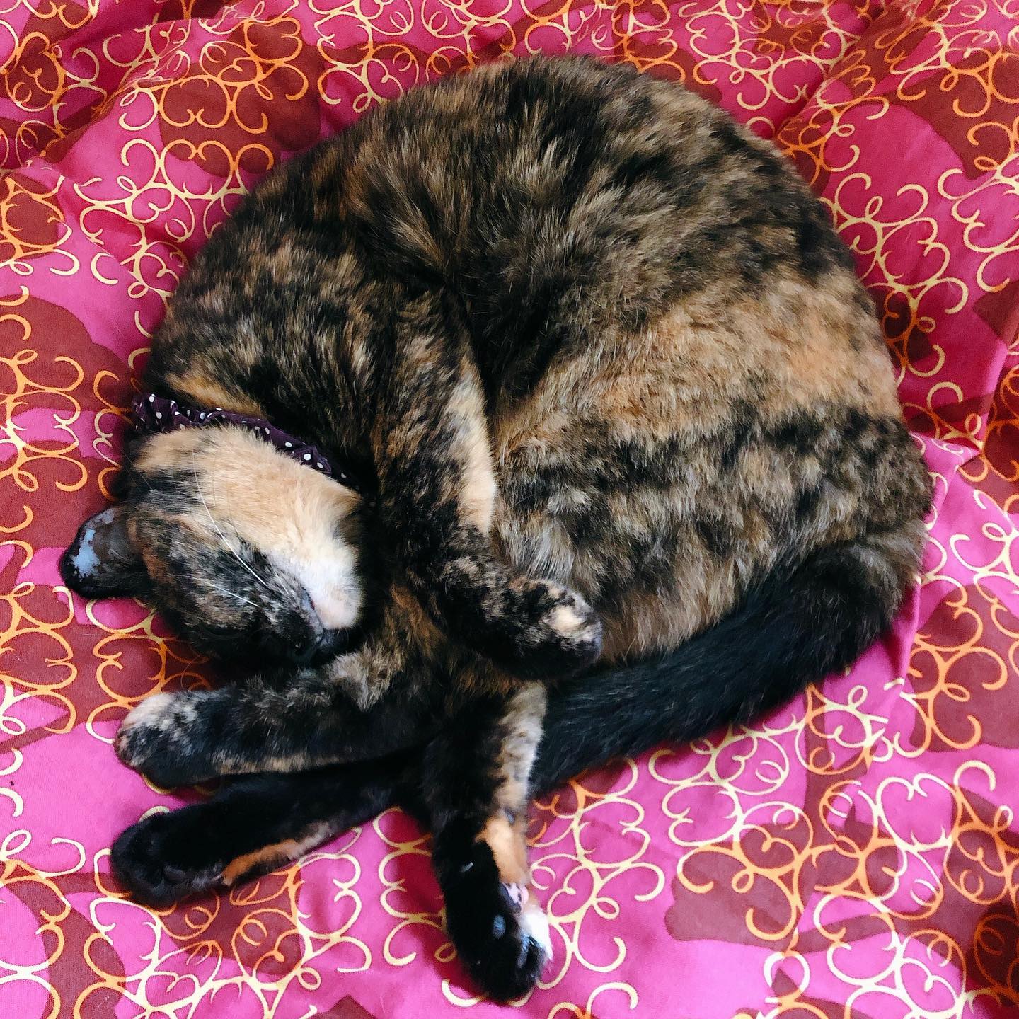 この投稿をInstagramで見る おやすみビビさん 寝方が海老みたい あったかいお布団出して 部屋の中の色も だんだん濃くなってきた … #cat #tortietude #さび猫 #サビ猫…