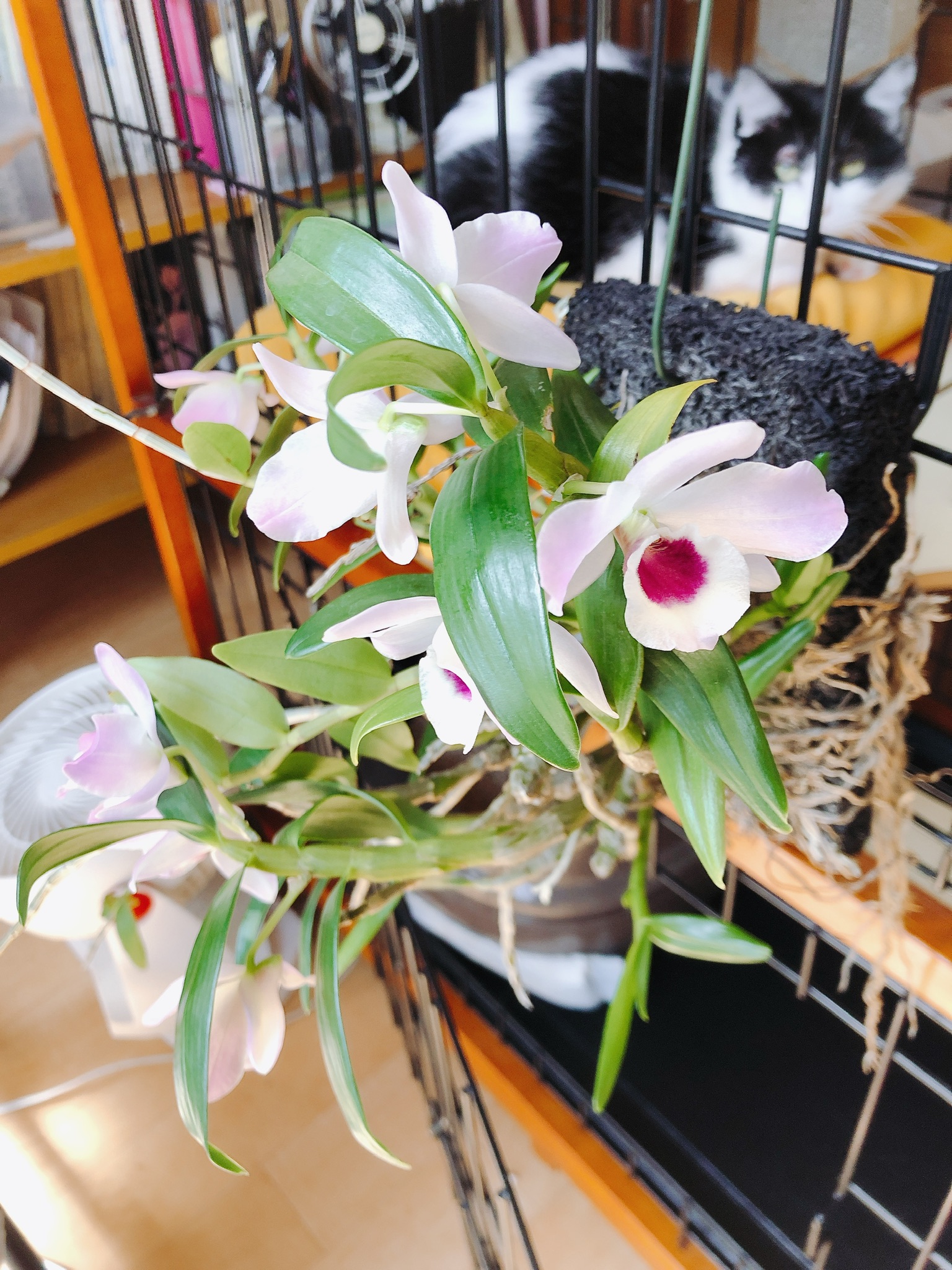 ヘゴ仕立てのSpring Newsが咲いた。鉢に植えたのは咲かなかった。ヘゴ仕立ての方が調子が良いのか、、、。 お花の後ろにいるのはハレちゃんです。