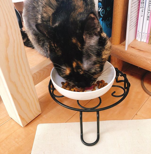 この投稿をInstagramで見る 最近、机の下からこうやって食べるようになってしまったビビさん。 なにかに似てると思ったらニワトリだった。 … #cat #tortietude #さび猫 #…