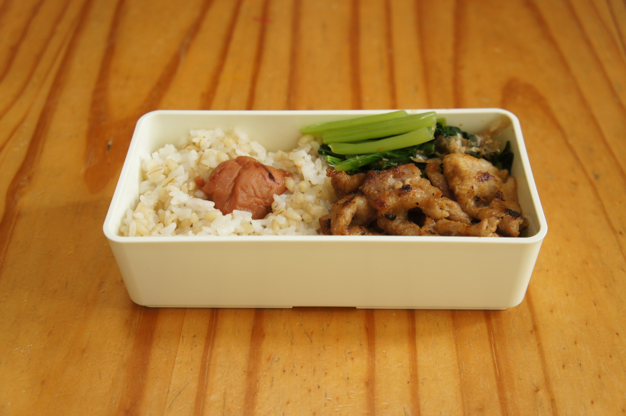 少し焼きすぎた生姜焼きのお弁当。そして、無性に食べたくなった3%の梅干しを買ってきてお弁当に。3%の梅干しってほぼフルーツよね。 豚の生姜焼き 小松菜のおひたし 3%梅干し もち麦入りご飯