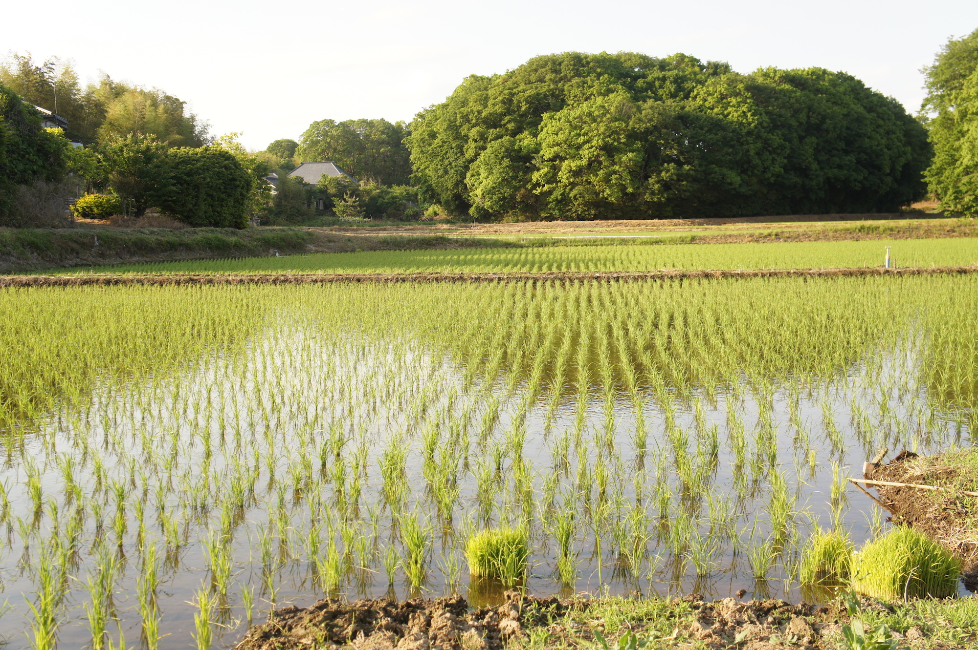 田んぼの稲が少しずつ成長してる。この角の稲の塊はきっと余っちゃったんだよね?
