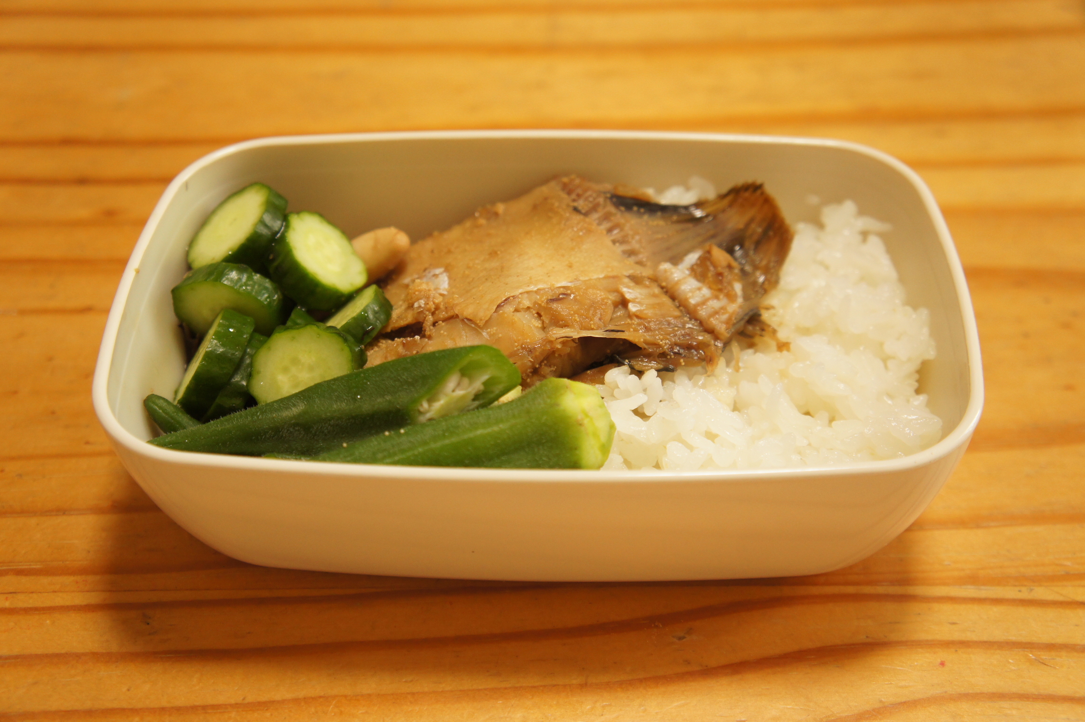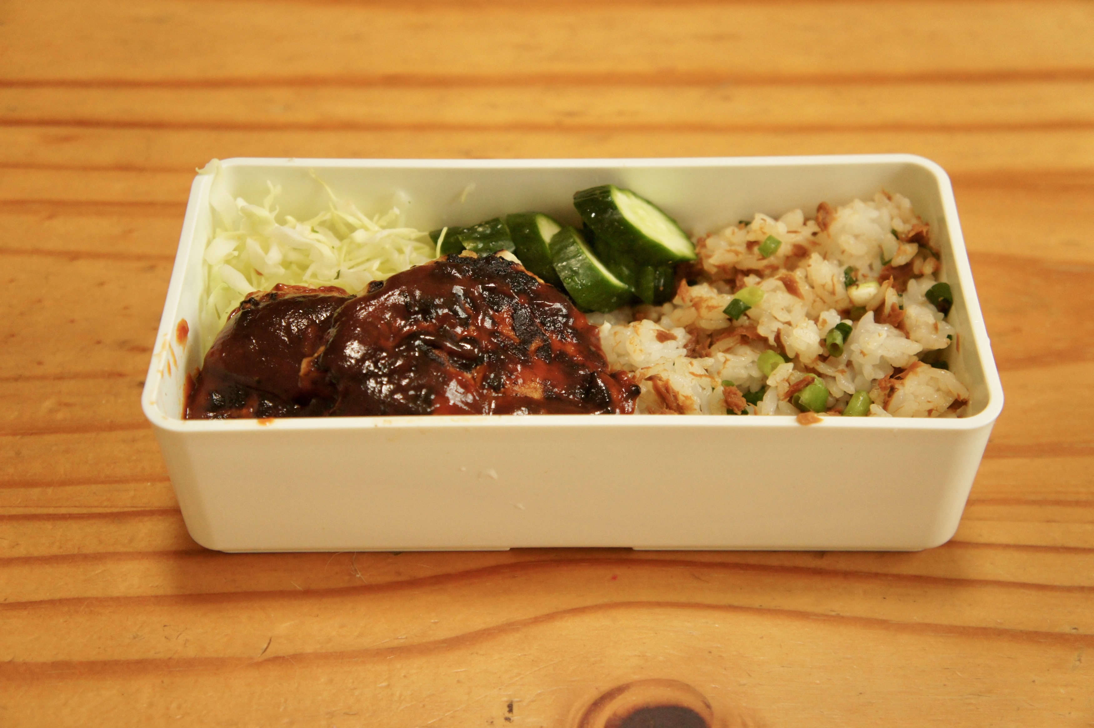 私は気がつくと野菜ばかり食べていることが多く、たまにはがっつりお肉も食べなきゃ、ってことでハンバーグ弁当。ご飯には缶詰のまぐろのフレークと小ねぎを混ぜ込んでます。 ハンバーグ きゅうりの塩もみ 千切りキャベツ まぐろのフ…
