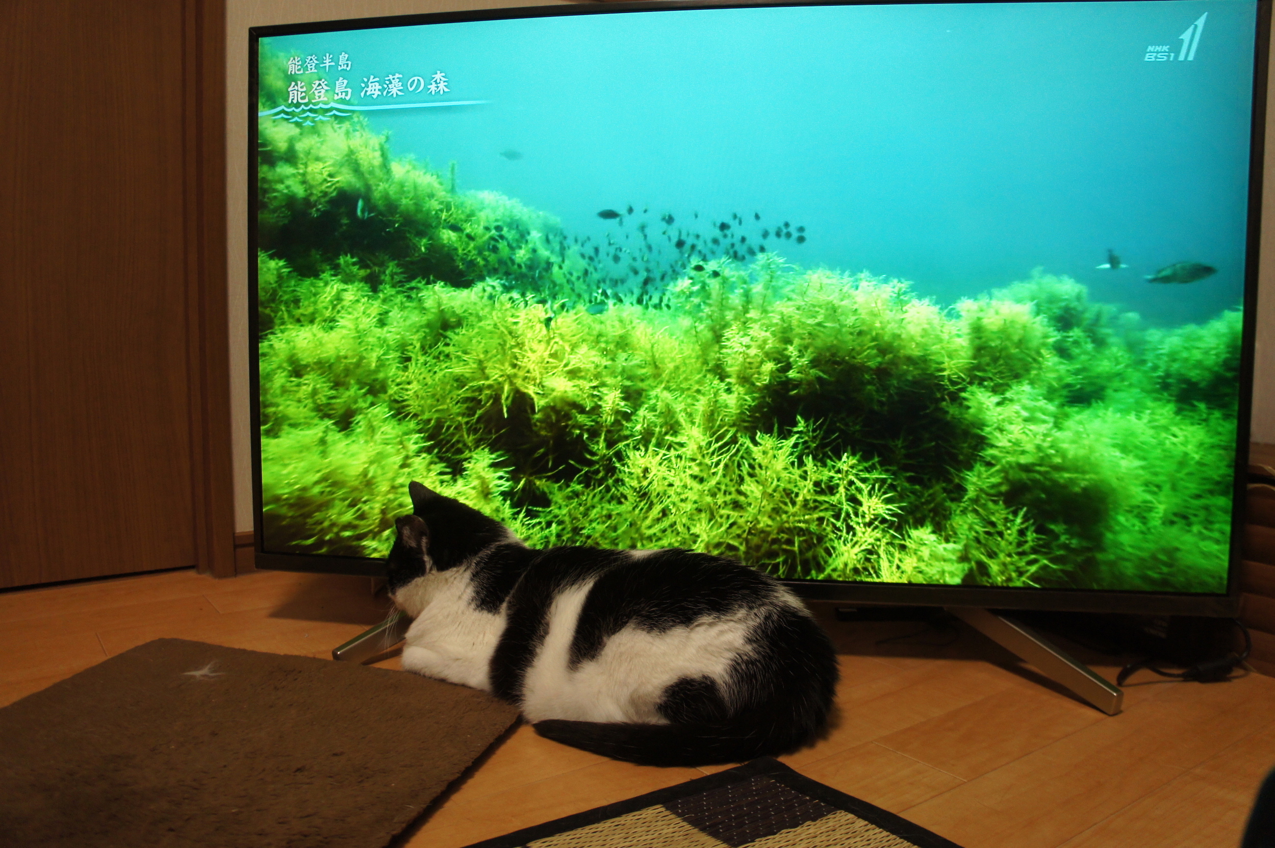 最近テレビの真ん中に居座る、ハレちゃん。このテレビはテレビ下端の真ん中にリモコンのセンサーがあるらしく、これだと全くリモコンでチャンネルを操作できない、、、。 ま綺麗な映像だし、海の映像とハレちゃんを鑑賞するよ、、、。