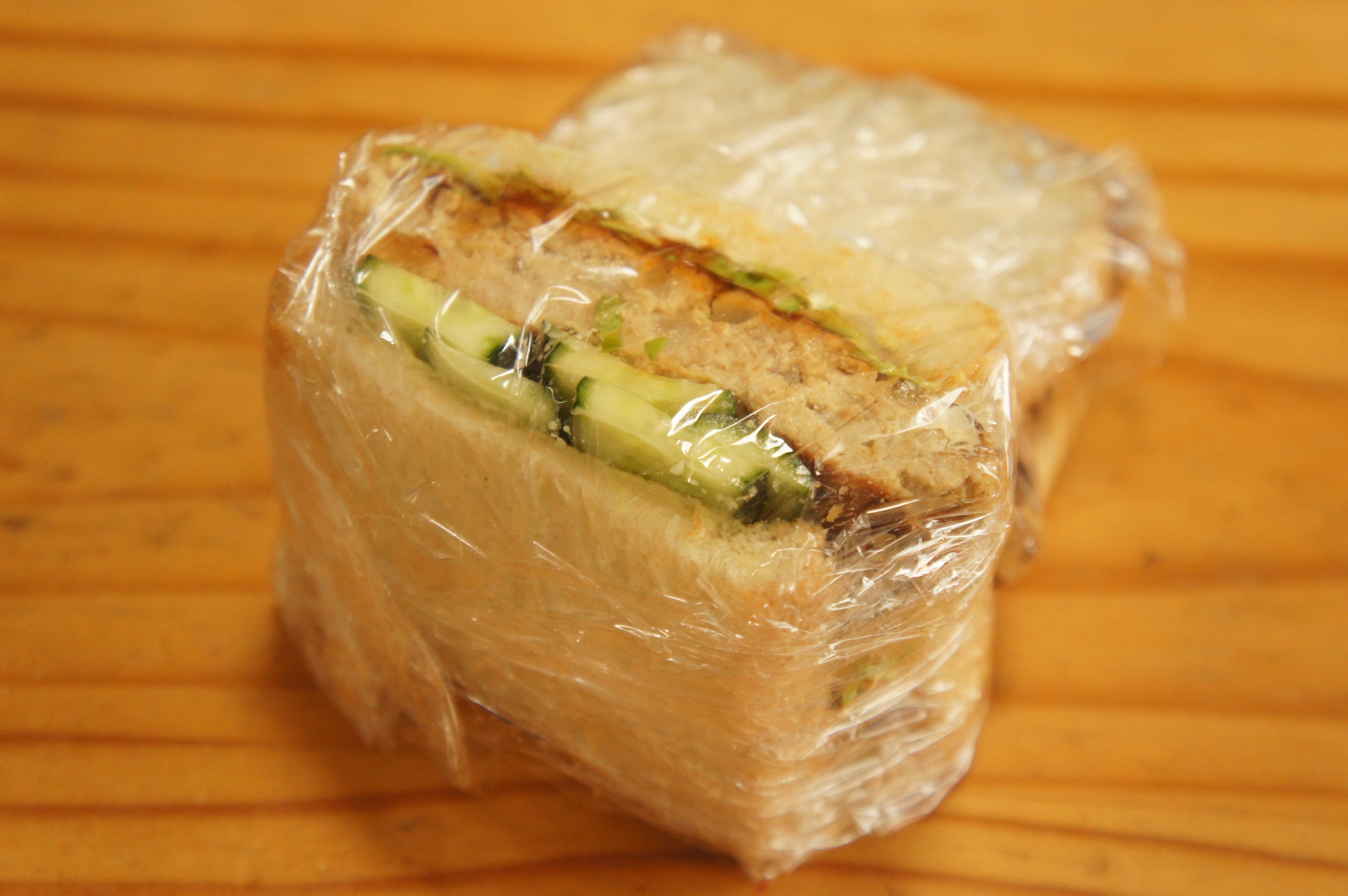 パンをトーストしてからマヨネーズを塗ってきゅうりとレタスを挟んだハンバーグサンド。