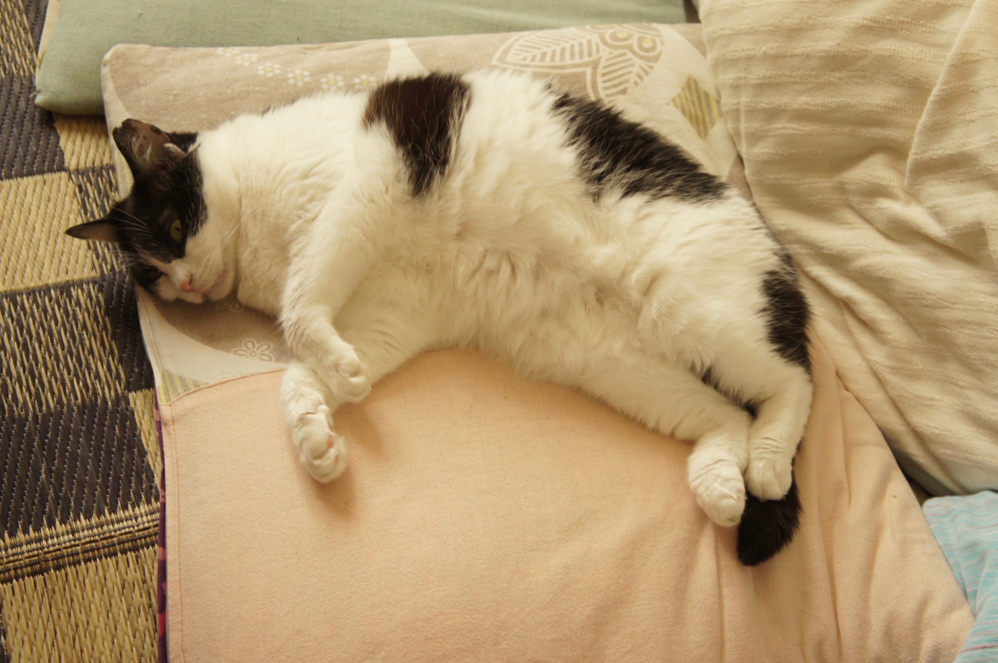 ハレちゃんは座布団とかマットの上が好き。暑いとお腹を出して寝ていて、お腹も触らせてくれるのでかなり人慣れしている風。でも、捕まえようとすると人間に非難の目を向けて逃げるので、まだ爪は切れません、、、。野良猫気質がまだまだ…
